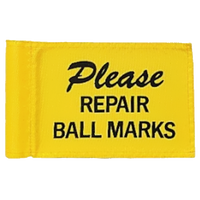 Gult placeringsflag med "Please Repair Ball Marks" i sort tekst. Passer til almindelig flagstang op til Ø 1,3 cm.